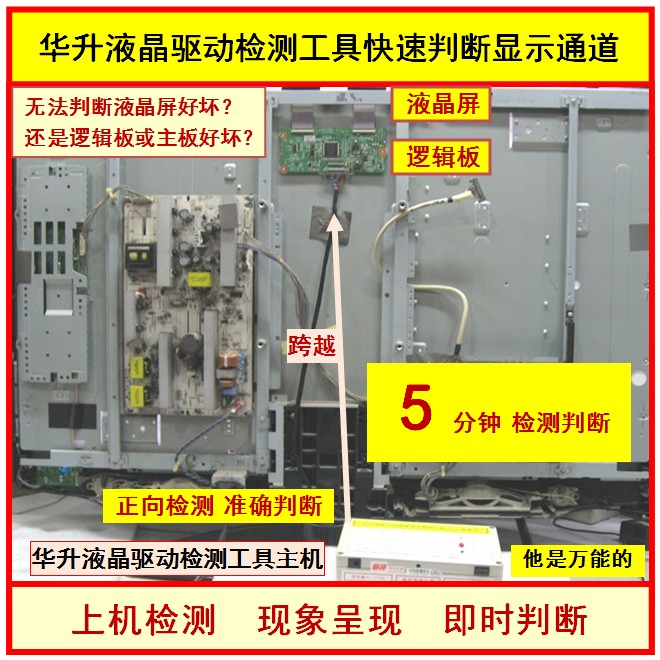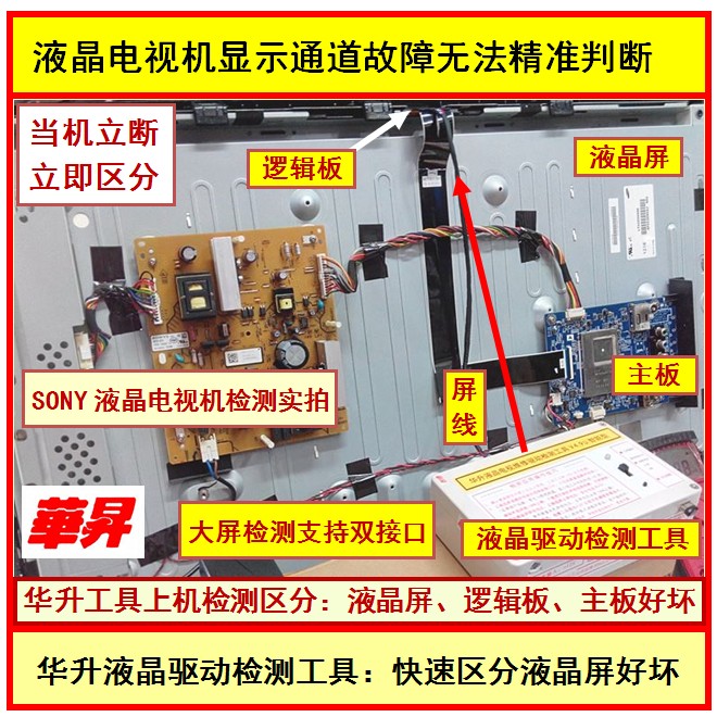 華升液晶電視機(jī)維修驅(qū)動檢測工具可對市面上各種品牌機(jī)快速檢測斷定故障部位,一般對一臺大屏幕液晶電視故障檢測可在三五分鐘內(nèi)完成,大大提高維修效率,快速判斷故障部位,更快成功報價維修!??!