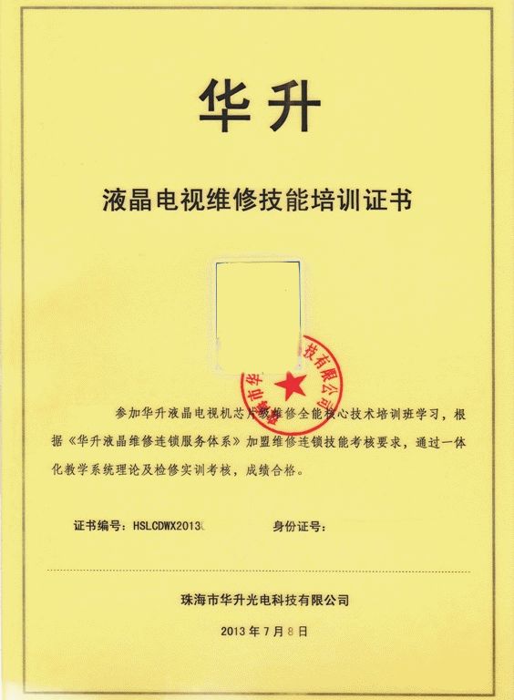 依照《華升液晶維修連鎖服務(wù)管理體系》,通過(guò)華升統(tǒng)一的理論考試、檢修實(shí)操考核合格后,頒發(fā)《液晶電視維修技能培訓(xùn)證書(shū)》;