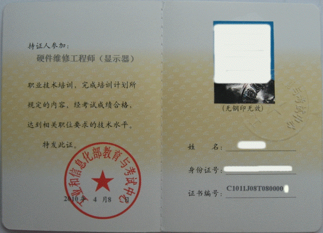 行業(yè)證書(shū):華升全國(guó)液晶維修行業(yè)技能證書(shū)