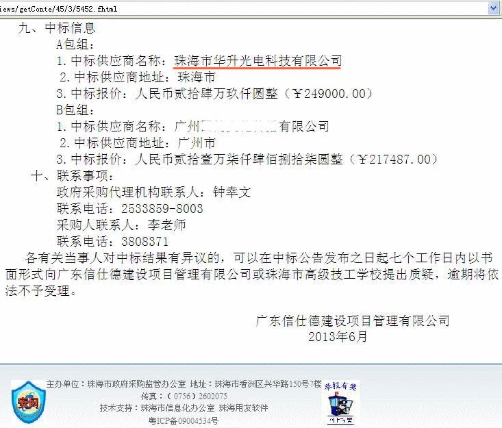 中標(biāo)企業(yè):珠海市華升光電科技有限公司
