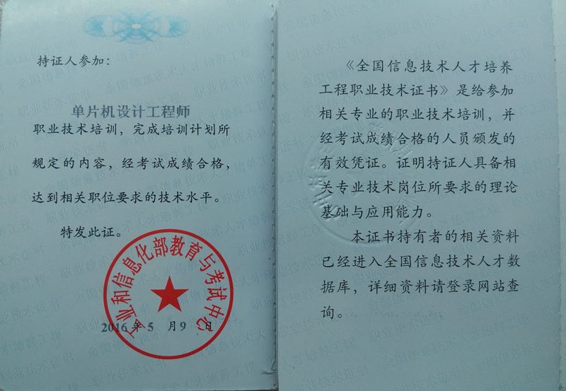 2016年4月參加國(guó)家工信部硬件工程師考證證書(shū)已到證
